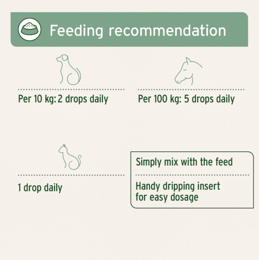 Dogs: 20 drops daily per 10 kg body weight