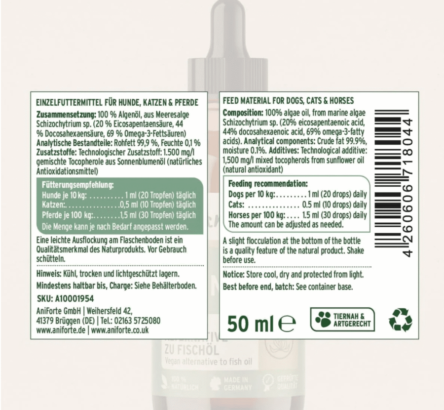 AniForte® Algae Oil is a complementary feed that supports kidney, urinary, heart, skin, and coat health. It is not a treatment for kidney disease or chronic conditions. Always consult your veterinarian before introducing new supplements, particularly for pets undergoing medical treatment or with pre-existing conditions.