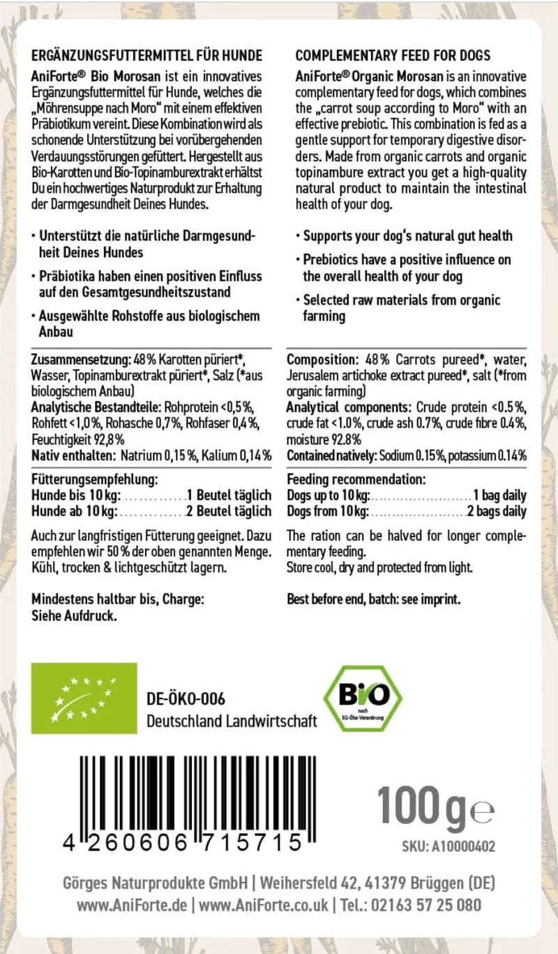 Support your dog’s digestive health with AniForte® Organic Morosan for Dogs (6X100g), a ready-to-eat, gentle puree inspired by the internationally known “Moro carrot soup” recipe. Carefully combined with organic Jerusalem artichoke extract and prebiotics, this innovative supplement is designed to support intestinal health, help with temporary diarrhoea, and improve overall digestive wellbeing.