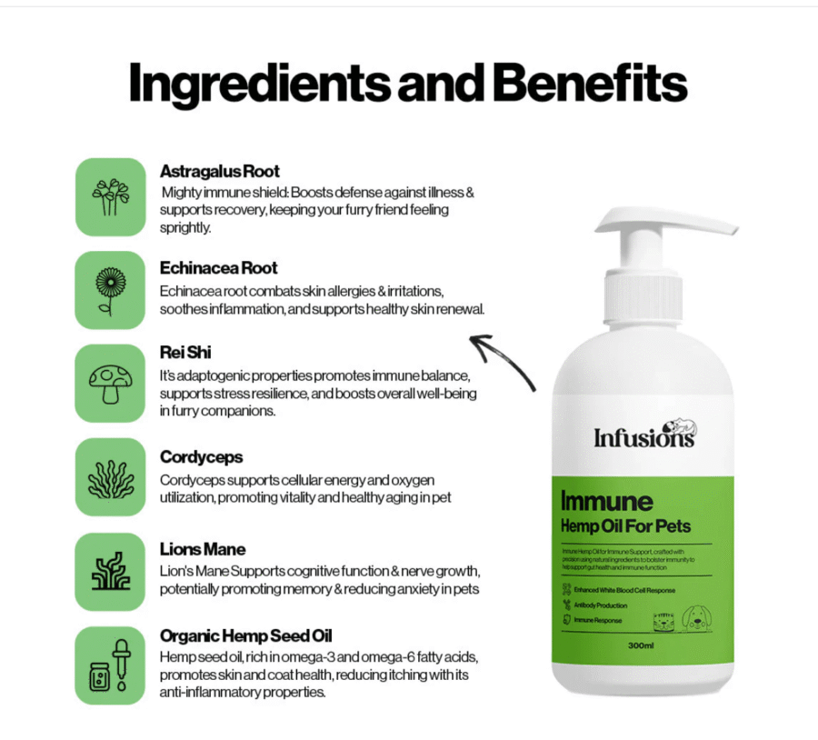 Immune Hemp Oil for Pets supports immunity and overall wellbeing. It is not a treatment for infections or renal disease. Always consult your veterinarian before starting any new supplement.