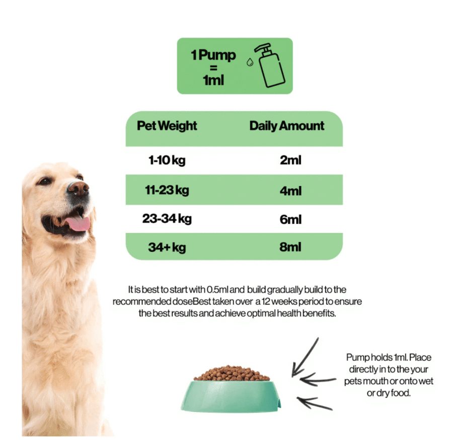 - Pet weight 23–34 kg → 6 ml daily
