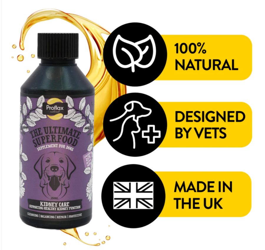 Proflax Kidney & Urinary Support Oil supports kidney and urinary wellbeing but is not a substitute for veterinary care. Always consult your vet if your dog is on medication, pregnant, nursing, or has known allergies. Store in a cool, dark place and keep sealed between uses.