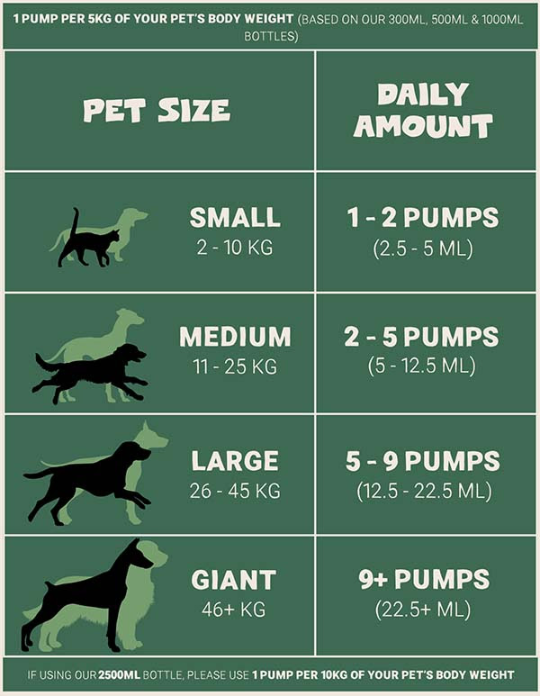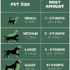 - Larger pets (2.5 L version): 1 pump per 10 kg body weight daily