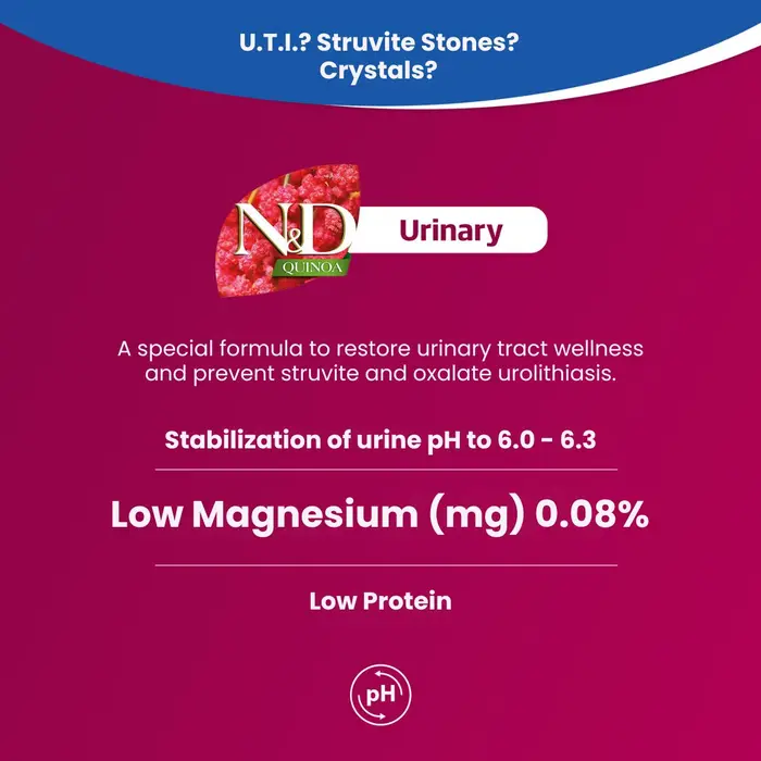 Hydration plays a crucial role in urinary health, helping to dilute the urine and prevent the formation of crystals. Combined with a low phosphorus and magnesium content, N&D Quinoa Urinary supports both urinary tract health and renal function, making it suitable even for cats with mild renal concerns.
