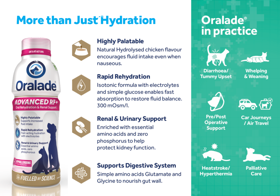 Keep your Dog or Cat fully hydrated while supporting kidney and urinary function with Oralade® Advanced RF+, the UK’s #1 veterinary oral rehydration supplement. This premium, ready-to-serve isotonic solution encourages fluid intake even in pets that are nauseous or reluctant to drink, restoring essential electrolytes and supporting digestive and renal health. Ideal for pets at risk of dehydration, kidney issues, or urinary sensitivities.