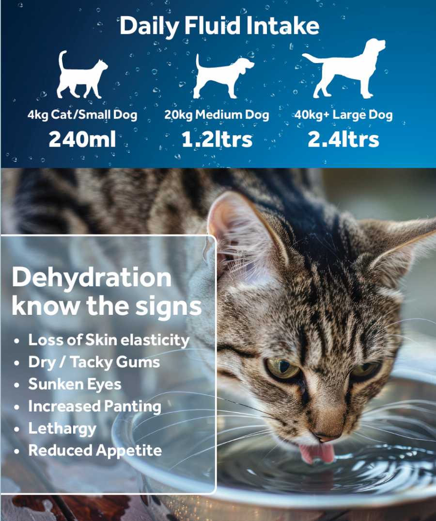 Hydration needs may vary depending on age, breed, and activity level. Additional fluids may be required in cases of fluid loss.