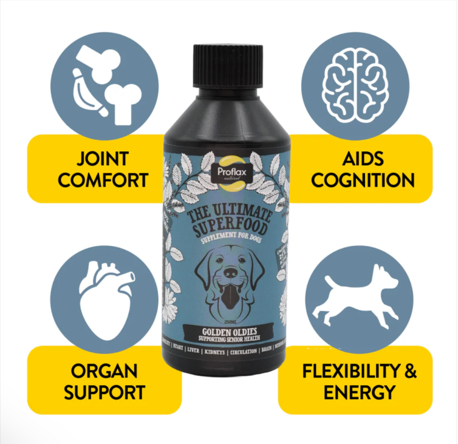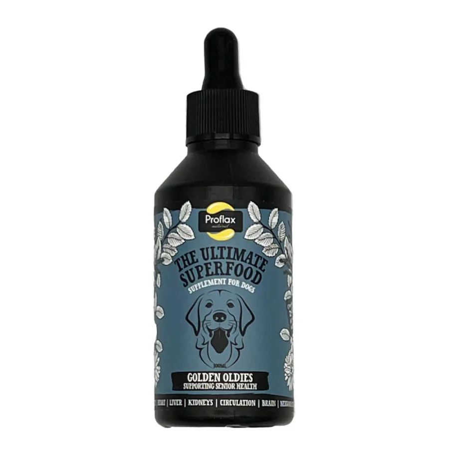 Support your senior dog’s mobility, cognitive function, organ health, and overall vitality with Proflax Golden Oldies, a 100% natural oil supplement specially formulated for dogs aged 7 and older. As dogs age, joints can stiffen, energy levels may drop, and vital organs like the kidneys, liver, and heart can begin to function less efficiently. Golden Oldies provides gentle, holistic support to help maintain joint flexibility, brain health, digestive efficiency, and urinary and kidney wellbeing, keeping older dogs active, comfortable, and happy.
