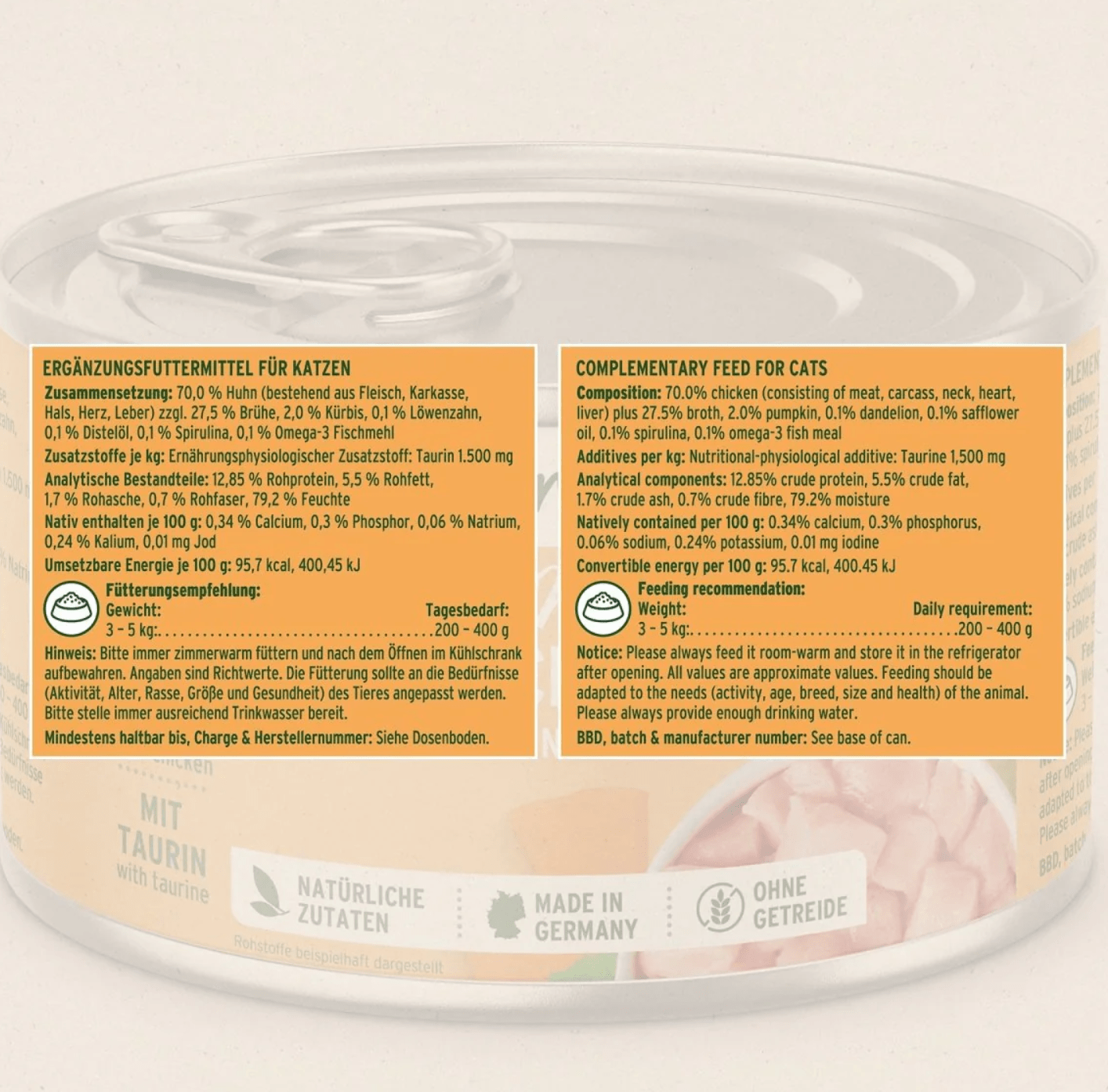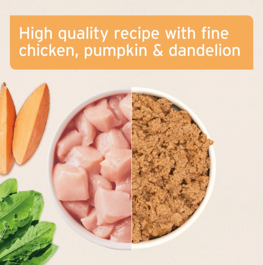 Chicken (70% – meat, carcass, neck, heart, liver), 27.5% broth, 2% pumpkin, 0.1% dandelion, 0.1% safflower oil, 0.1% spirulina, 0.1% Omega-3 fish meal.