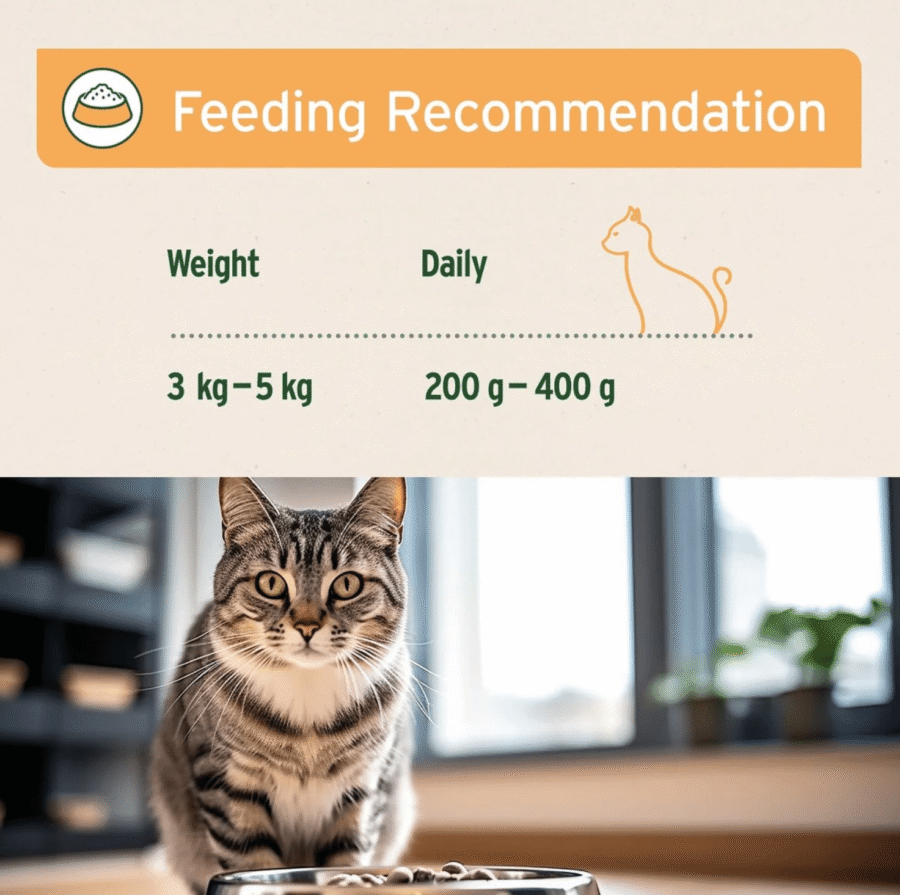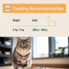 Feed approximately 200 g per 3.5 kg of body weight per day. Always serve at room temperature and provide plenty of fresh drinking water. Adjust portions to your cat’s size, age, and activity level.