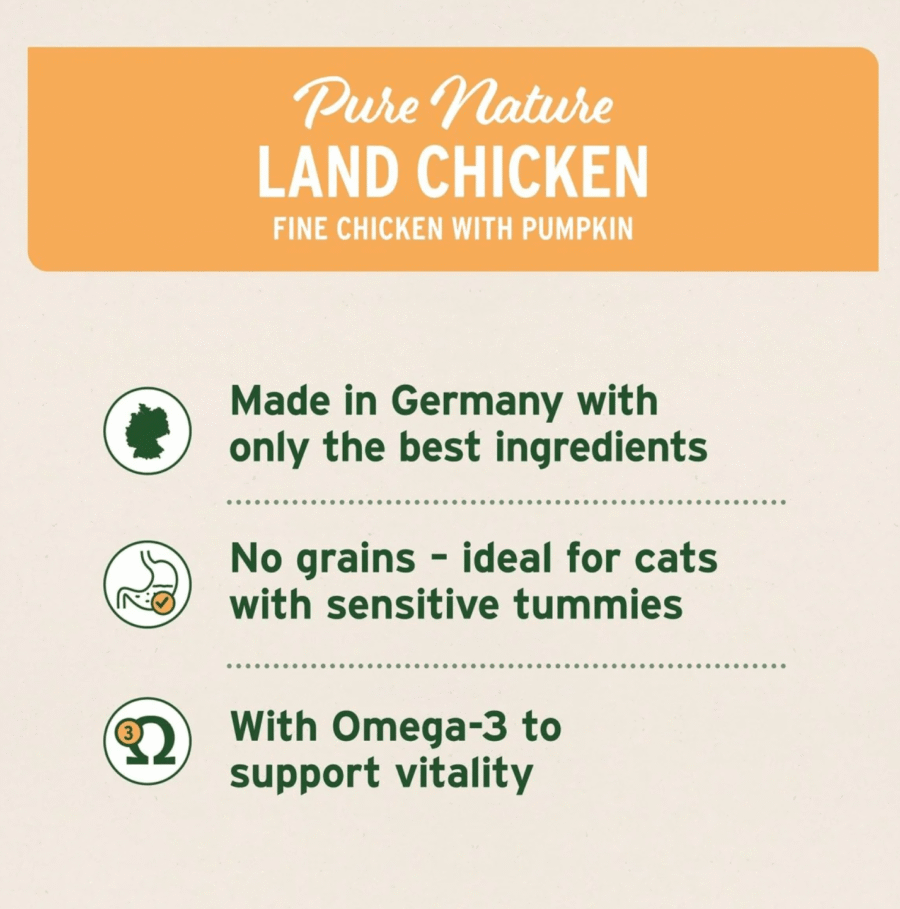 Support your cat’s wellbeing — including urinary and kidney health — with this gentle, easily digestible wet food made from 100% natural ingredients. AniForte® PureNature Chicken combines tender chicken meat, heart, and offal with a mix of vegetables, Omega-3, and spirulina for a nourishing meal that’s as wholesome as it is delicious. Perfect for cats with sensitive digestion, urinary or renal sensitivities, or those needing light, high-quality nutrition.