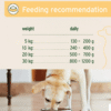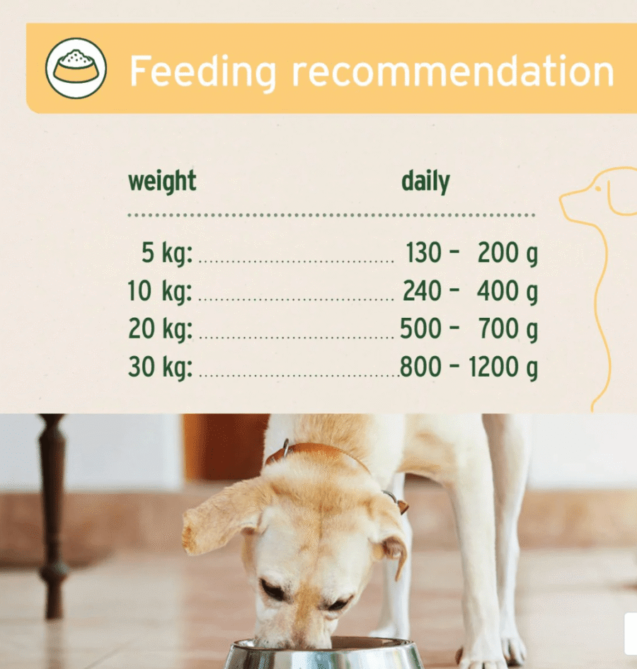 Feed approximately 130–200g per 5kg of body weight per day. Always serve at room temperature and provide plenty of fresh drinking water. Adjust portions to your dog’s size, age, and activity level.
