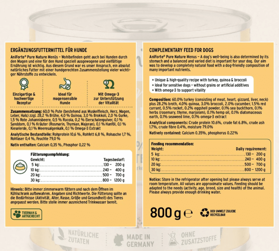 Support your dog’s wellbeing — including urinary and kidney health — with this gentle, easily digestible wet food made from 100% natural ingredients. AniForte® PureNature GreenField Turkey combines tender turkey meat, healthy vegetables, and gluten-free quinoa for a nourishing meal that’s as wholesome as it is delicious. Perfect for dogs with sensitive digestion, low activity levels, or those needing light, high-quality nutrition.